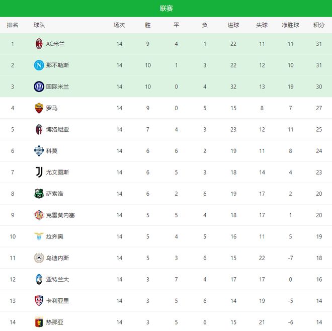 意甲积分榜:争冠白热化,米兰1球净胜球优势领先那不勒斯居首